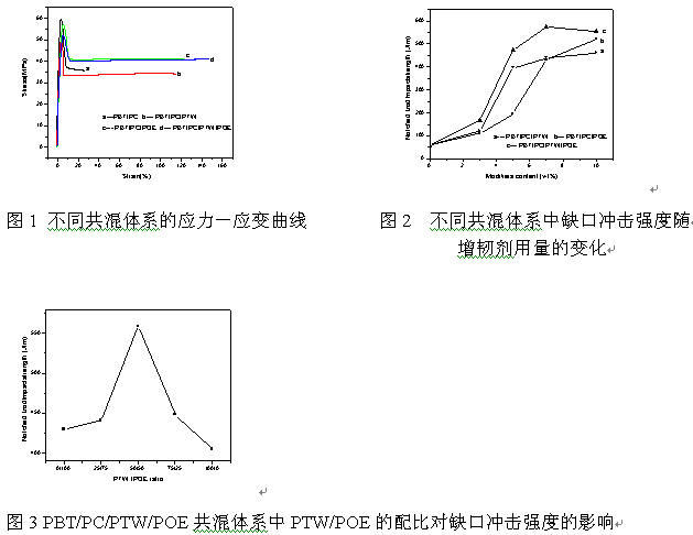 實(shí)驗(yàn)部分: 先將聚碳酸酯(PC,牌號(hào):PC110,旭美化成股份有限公司),聚對(duì)苯二甲酸丁二醇酯(PBT,牌號(hào):L2100-G,儀化集團(tuán)公司工程塑料廠)用真空烘箱在120℃下干燥4小時(shí)后,與乙烯-丙烯酸丁酯-甲基丙烯酸縮水甘油酯共聚物(PTW,牌號(hào):ElvaloyPTW,DuPont),乙烯-辛烯共聚物(POE,牌號(hào):Engage8180,DuPont-Dow)一起加入到雙螺桿擠出機(jī)中進(jìn)行混煉,共混溫度為230-250℃,螺桿轉(zhuǎn)速為250-350rpm,將擠出的粒料用普通烘箱在100℃下干燥4小時(shí)后在注塑機(jī)上制得標(biāo)準(zhǔn)樣條,注塑溫度為:230-259℃。試樣分別按照ISO R527,ISO 178,ISO 180標(biāo)準(zhǔn)測試?yán)?、彎曲、沖擊等性能指標(biāo)。