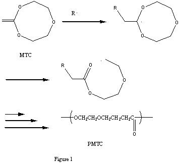 We tried radical polymerization of cyclic ketene acetal in order to synthesize a novel polyhydroxyalkanoate. 2-Methylene-1,3,6-trioxocane (MTC) was synthesized and polymerized via ring-opening in the presence of radical initiator to produce poly(ester-ether) (PMTC) as a novel polyhydroxyalkanoate as shown in Figure 1. The obtained PMTC was found to be biodegradable as measured by total organic carbon (TOC) and biochemical oxygen demand (BOD).
