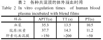 將綜合性能較好的肝素化膠原/絲素共混膜進(jìn)行體外凝血時(shí)間APTT、TT、PT測(cè)定,并與健康人血漿進(jìn)行對(duì)照,各重復(fù)3次,取其平均值,結(jié)果如表2所示。