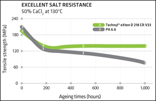 該款新材料最初專為日本和韓國汽車制造商而開發(fā),具有較強的耐氯化鈣特性——氯化鈣是氣候寒冷的國家如俄羅斯最常用的道路化冰鹽。系統(tǒng)供應(yīng)商法雷奧之所以選擇Technyl®eXten,是因為它具有比金屬或其它塑料材料高得多的優(yōu)異性價比。該材料完全通過嚴(yán)格的測試批準(zhǔn),將用于未來雷諾-尼桑新車型的散熱器水室。