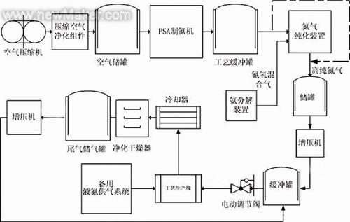 橡膠輪胎硫化工藝中,以往均采用水蒸汽來給膠囊充壓,這大大降低了膠囊的使用壽命,國外一般采用99.99%純度的氮氣注入膠囊,有效提高了膠囊的使用次數(shù)。從用氣成本和膠囊成本綜合考慮,明顯優(yōu)于老的工藝方法。瑞氣制氮系統(tǒng)采用如圖所示流程,空氣壓縮機排出的壓縮空氣經(jīng)壓縮空氣凈化組件除油、除水、除塵后,進(jìn)入空氣儲罐,再由PSA制氮機將氮、氧分離,富氧氣體排放,富氮氣體存入工藝緩沖罐。在氮氣純化裝置中,通過向低純氮氣中加入氨分解產(chǎn)生的氮氫混合氣,氮氣中的氧氣與氨分解氣中的氫氣在催化劑作用下生成水從而除去氧氣,然后送入儲罐以備增壓。氮氣增壓機將高純氮氣從0.55MPa升壓到3.3MPa,高壓氮氣經(jīng)電動調(diào)節(jié)閥減壓至用戶所需用氣壓力,隨后進(jìn)入工藝生產(chǎn)線。如PSA制氮系統(tǒng)發(fā)生故障或定期檢修,則由備用液氮系統(tǒng)向生產(chǎn)線供氣,確保生產(chǎn)供氣連續(xù)。因為在橡膠輪胎的硫化工藝中,氮氣經(jīng)使用后主要是攜帶了部分水蒸汽、粉塵,且壓力有了明顯降低、溫度有明顯的提高,如將其回收處理后再使用,不僅可以節(jié)約大量成本,而且能解決排放污染問題。本系統(tǒng)采用了對廢氣進(jìn)行回收處理,它首先將廢氣通入水冷卻器降溫,再經(jīng)凈化干燥裝置除水、除塵,送入儲氣罐重新升壓后并入主供氣管線使用。本系統(tǒng)高純氮氣由PSA制氮加氮氣純化制得,如用戶在實際生產(chǎn)過程中因生產(chǎn)任務(wù)變化而用氣量減少到一半時,PSA制氮機的產(chǎn)氮純度便可滿足工藝要求,此時可以將氨分裝置和氮氣純化裝置停機,如上圖虛線所示將PSA制氮機的產(chǎn)品氣直接送入增壓機前的低壓氮氣儲罐。這樣,可以有效降低使用成本,而且簡化操作難度。