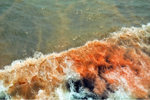 14時許,“中國海監(jiān)15”船開始返程,在離B平臺約3海里、C平臺約2海里的地方,一條吞吐著紅色泡沫的巨大赤潮帶出現(xiàn)在記者眼前。崔文林立即安排工作人員對赤潮帶進(jìn)行了水體取樣。記者問這條赤潮帶是否因為此次溢油事故引發(fā),崔文林回答說:“這還需要進(jìn)一步的監(jiān)測和論證。”