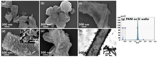 Fig. 1. 使用QaQ?、(bQ?2、(cQ?8、(dQ?4和(eQ?6 h制备的SEM图;使用24时制备PANI的(fQTEM囑֒QgQEDX光谱图?/span>