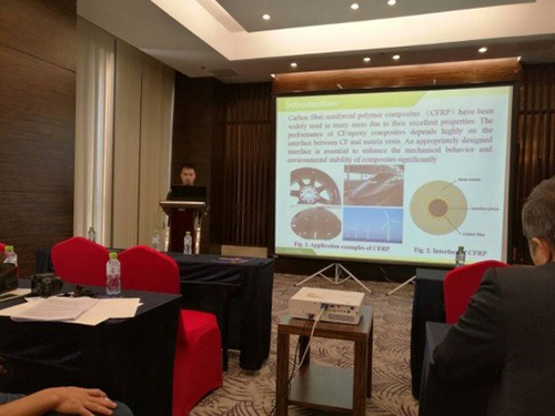 寧波材料所所屬二級所先進制造所復合材料智能制造與裝備團隊博士后徐海兵與碩士生李伶通參加了本次會議,并分別作了題為“Preparation and properties of self-emulsifying sizing agent modified with grapheneoxide”,“A comparison study on heat-resistanceof the epoxy sizing and novel polyphosphazene coating and its influence on interfacial property of CF/epoxy composites” ,“Influenceof graphene oxide modified sizing on the interfacial properties of carbon fiber/epoxy composites”,“Chemically grafting polyphosphazene microspheres onto carbon fibers for enhancing interfacial strength in carbon fiber composites”的英文口頭報告,向國內(nèi)外復合材料領域的專家學者介紹了復合材料智能制造與裝備團隊在復合材料界面改性、汽車輕量化方面的最新研究進展,引起了與會專家們的廣泛興趣,并展開了熱烈的交流互動。