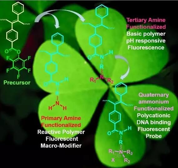 課題組繼成功地利用活性酯和點擊化學的方法實現(xiàn)了對雙取代聚炔(簡稱PDSAs)的后修飾工作(Polym. Chem., 2015, 6, 7958-7963)后,在拓展工作中,發(fā)現(xiàn)含有五氟苯酯的結(jié)構(gòu)可以直接在鎢催化劑中聚合,課題組基于此拓展了后修飾平臺。通過統(tǒng)一前驅(qū)體制備了含有不同種類胺的雙取代聚炔,它們由于含有不同的結(jié)構(gòu)分別表現(xiàn)出與氧化石墨烯雜化、用作pH探針和與DNA大分子結(jié)合等性質(zhì)。這一平臺的優(yōu)勢體現(xiàn)在高效、方便、產(chǎn)率高等方面。