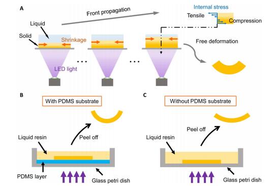 這一技術將明暗形狀的灰度圖投影到盤子上或者兩塊載玻片中間的液體丙烯酸鹽聚合物薄層上。混入聚合物中的光引發(fā)劑材料受到尋常的LED投影燈的照射,啟動交聯(lián)反應,形成固態(tài)薄膜。聚合物浸染的光吸收劑起到光線調(diào)控作用。由于光固化過程中聚合物網(wǎng)絡演變和體積收縮之間的復雜反應,聚合物中接受光線較少的區(qū)域更容易彎曲。
