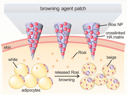 顧臻和強(qiáng)力教授領(lǐng)導(dǎo)的團(tuán)隊(duì)目前已開(kāi)發(fā)了一款全新的減肥貼片。這張貼片上密布“微針”,每一根的直徑都只有300微米。在如此細(xì)微的結(jié)構(gòu)上,科學(xué)家們進(jìn)一步植入了納米顆!鼈兊某叽缭250納米左右,相當(dāng)于人頭發(fā)絲的1/400。這些納米顆粒中含有“褐化”藥物羅格列酮,以及協(xié)助藥物釋放的葡萄糖氧化酶與過(guò)氧化氫酶。在有葡萄糖存在的情況下,這兩種酶能有效營(yíng)造出酸性的微環(huán)境,促使藥物的釋放。