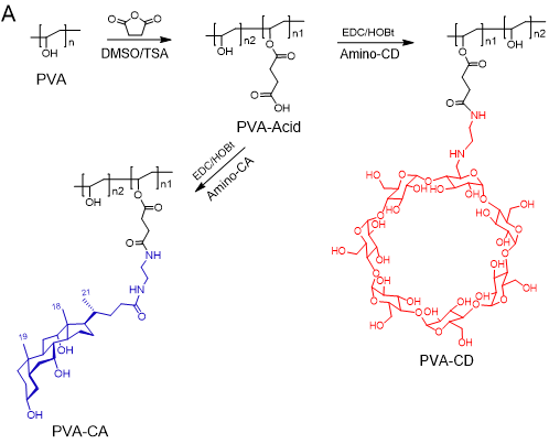(A) 基于PVA的主客體聚合物PVA-CD與PVA-CA的合成路線;
