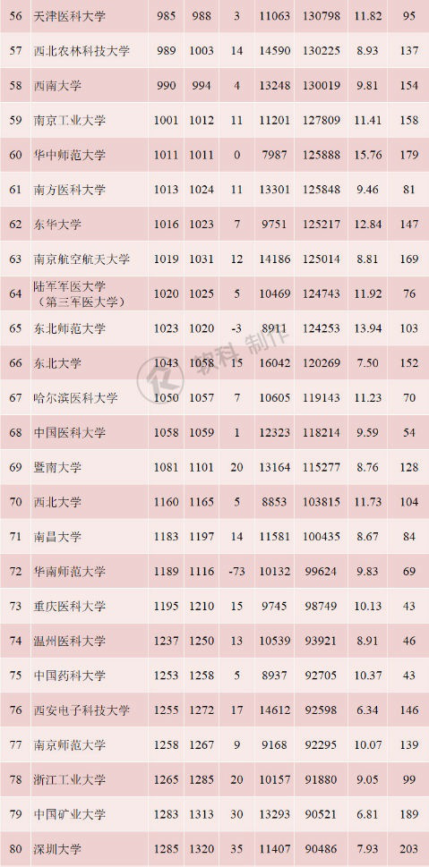 另外,根據(jù)統(tǒng)計數(shù)據(jù)可以看到,此次,中國大部分高校都有上升,少數(shù)出現(xiàn)下滑。上升較為明顯的大學(xué)有華中科技大學(xué),哈爾濱工業(yè)大學(xué)、天津大學(xué)、北京航空航天大學(xué)、北京科技大學(xué)、電子科技大學(xué)、鄭州大學(xué)、武漢理工大學(xué)、華中農(nóng)業(yè)大學(xué)、江蘇大學(xué)、中國石油大學(xué)、西北農(nóng)林科技大學(xué)等高校。