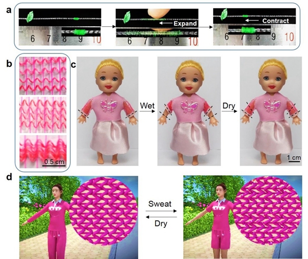 記者在該實(shí)驗(yàn)室看到,研究人員用蠶絲伸縮肌肉編織了一件玩偶大小的智能上衣,實(shí)現(xiàn)了環(huán)境濕度增加時(shí)(例如,由于汗水或潮濕環(huán)境),智能上衣的衣袖長(zhǎng)度收縮至原長(zhǎng)度的一半;濕度下降時(shí)又恢復(fù)如初。這種水分敏感的紡織品,可以通過(guò)改變宏觀形狀非常有效地實(shí)現(xiàn)水分和熱量的管理功能。