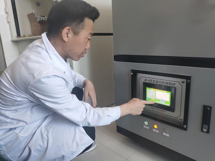 當(dāng)天上午,該所實驗員葸雄宇正半蹲著查看玄武巖石料溶制爐的溫度參數(shù),這只是實驗中的一個小步驟。葸雄宇介紹,從各地收集來的玄武巖原石在進行破碎、清洗和干燥后,加入到熔制爐中,當(dāng)爐內(nèi)溫度升高至1500℃后,原石逐漸融化成液態(tài),內(nèi)部的各種物質(zhì)也在高溫作用下變得均勻。實驗人員需要用特制鉗子將液態(tài)玄武巖取出,讓其自然冷卻變成固體熟料。由于此時爐內(nèi)溫度高達1500℃,即使距離半米開外,也可能會被熱氣灼傷,實驗人員需要身穿特質(zhì)的耐高溫裝備。