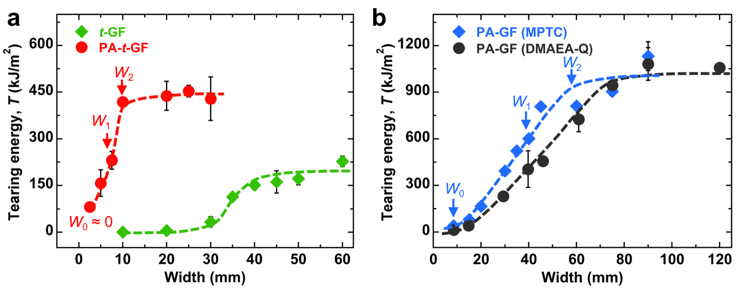 近年來,日本北海道大學龔劍萍教授團隊研究人員將玻璃纖維布(GF)與一種新型的高韌性兩性聚電解質(zhì)(PA)水凝膠結(jié)合,其中該新型水凝膠在水中表現(xiàn)出適度的體積收縮,而且能夠與纖維表面形成優(yōu)異的界面粘結(jié),從而開發(fā)出了具有高拉伸強度、拉伸模量和撕裂韌性的復合水凝膠 (Mater. Horiz., 2, 584–591, 2015; Adv. Funct. Mater., 27, 1605350, 2017)。最近,龔教授團隊進一步研究發(fā)現(xiàn)該纖維增強水凝膠隨著樣品尺寸的增大而表現(xiàn)出逐漸提高的抗撕裂能力,并在尺寸達到一個特定值時,該復合水凝膠能夠獲得非尺寸依賴、超高的抗撕裂能(破壞能:~1000 kJ/m2),甚至優(yōu)于一些高韌性的金屬和合金材料(J. Mater. Chem. A, DOI: 10.1039/C9TA02326G, 2019)。該研究認為復合水凝膠在撕裂破壞過程中所表現(xiàn)出的十分優(yōu)異的抗撕裂性能主要源于其非常大的撕裂過程區(qū)的巨大能量耗散。這類具有優(yōu)異機械性能的新型復合水凝膠成為有效連接軟材料和傳統(tǒng)硬材料之間的橋梁。