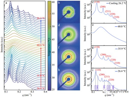 圖4. (a) PI440-b-P2VP370球形膠束在原位退火過程中的一維SAXS曲線變化; 典型的二維SAXS圖像和一維SAXS曲線: (h, i) 26.4 °C; (f, g) 35.9 °C; (d, e) 60.0 °C; (b, c) 26.2 °C (降溫終態(tài))