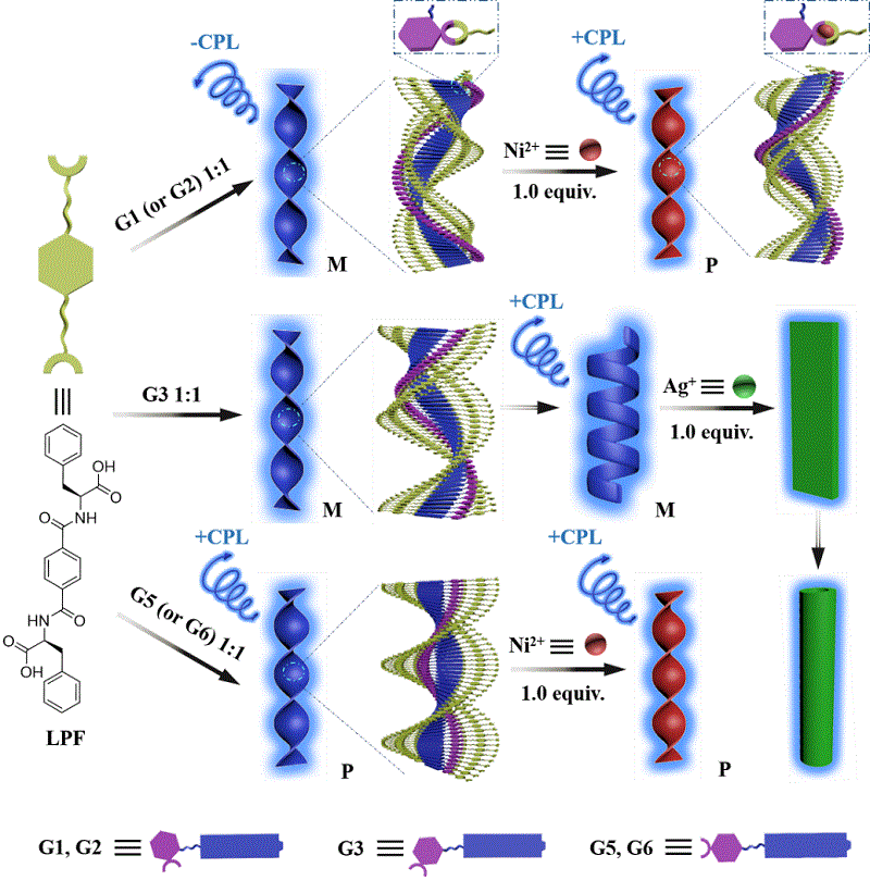 圖1.圖示手性凝膠因子與非手性的香豆素衍生物在不同比例以及金屬離子存在下組裝形成的手性納米結(jié)構(gòu),M代表左旋納米結(jié)構(gòu),P代表右旋納米結(jié)構(gòu)。超分子凝膠的手性和CPL性質(zhì)可通過(guò)改變香豆素衍生物吡啶環(huán)上的氮原子的空間位置或是簡(jiǎn)單地引入金屬離子進(jìn)行有效調(diào)控。
