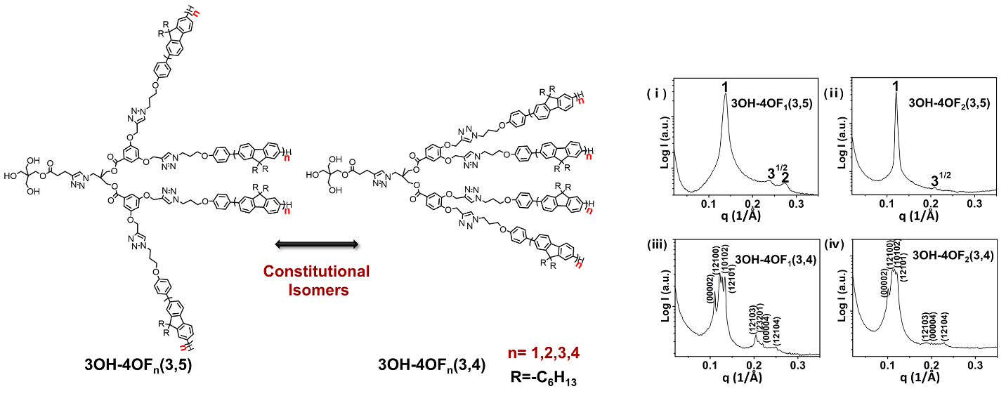 在此研究中,研究者首先精確地合成了四種樹枝狀三羥基官能化的棒狀寡聚芴分子,命名為3OH-XOFn(P)。三羥基官能團與烷基側(cè)鏈的引入,成功地打破了棒狀分子間的平行排列。研究者進一步通過精確調(diào)節(jié)寡聚芴分子的數(shù)量(X=2-4)、寡聚芴分子的長度(n=1-4)以及寡聚芴分子的分叉位置 (P=3,5 或者 3,4),得到了一系列自組裝形成的高度有序納米結(jié)構(gòu)(圖1)。
