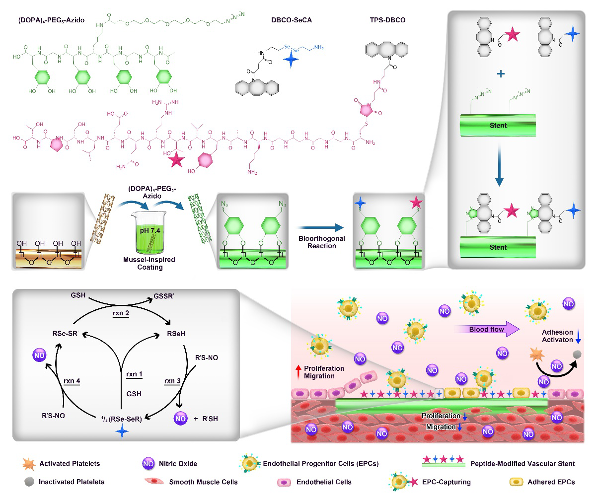 圖1. 可生物正交貽貝靈感多肽模擬物的分子結(jié)構(gòu)及其應(yīng)用于血管支架的表面改性。