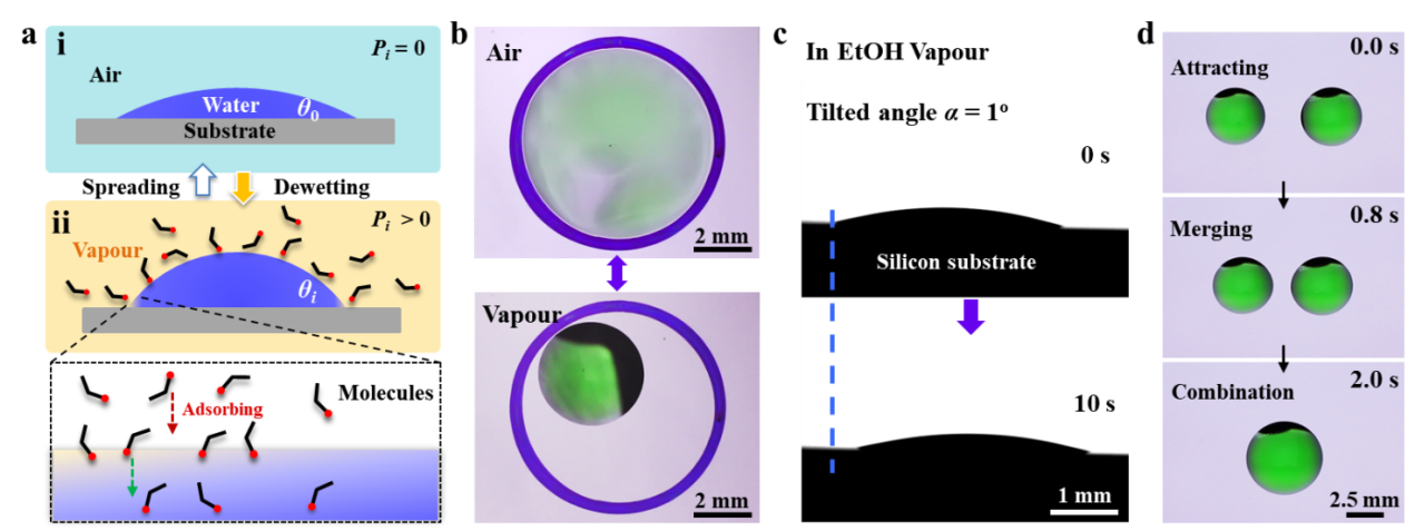如圖1所示,在空氣中引入一定濃度乙醇?xì)夥眨?gt; 0.5 kPa)時(shí),超親基底上的水滴將會(huì)出現(xiàn)顯著的接觸角增大現(xiàn)象。這一現(xiàn)象廣泛存在于低表面張力小分子氣體和高表面能液體之間。以乙醇?xì)夥蘸退螢槔軞庖航缑嫖胶鸵后w相分子擴(kuò)散的影響,乙醇分子在液滴的表面濃度由三相線到中心遞減,造成局部的張力降低并誘發(fā)向液滴中心的馬拉格尼流。定向的馬拉格尼流使液滴展現(xiàn)出收縮態(tài)。收縮態(tài)液滴的滾動(dòng)角低至1°,展現(xiàn)出高滑移性。此外,氣氛環(huán)境下液滴間具有遠(yuǎn)程吸引和自發(fā)聚并行為,這些特性為后期的液體操控奠定了基礎(chǔ)。