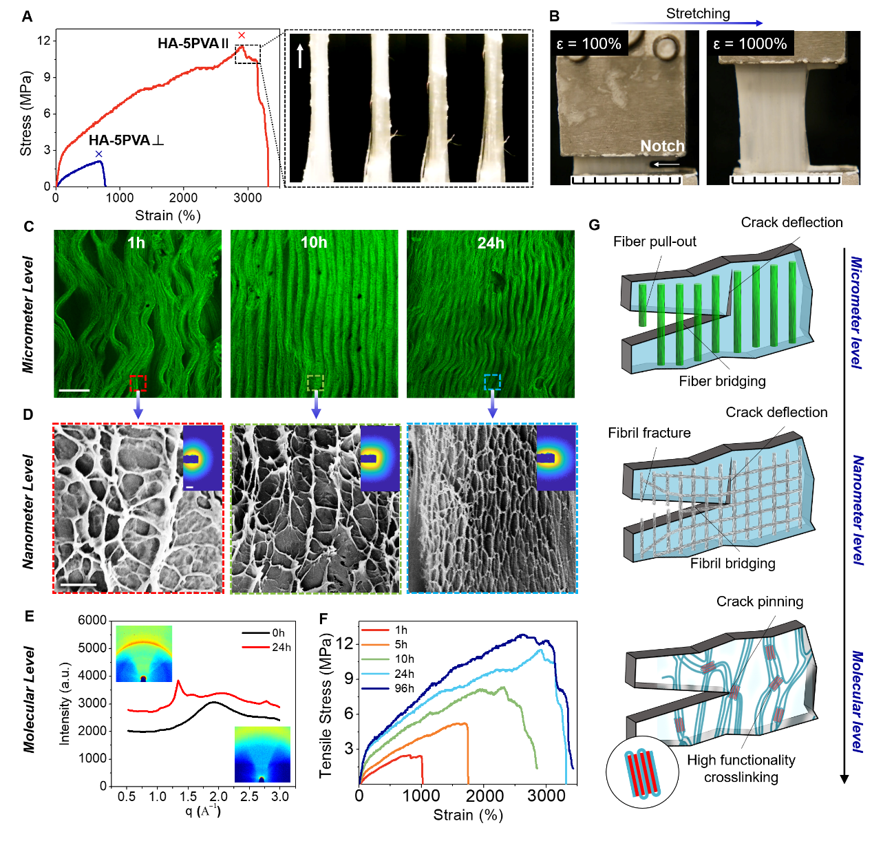 該凝膠在含水量90%的前提下仍可達到2900%的拉伸應(yīng)變及11.5MPa的拉伸強度,并且表現(xiàn)出優(yōu)異的裂紋擴展抑制性。該凝膠優(yōu)異的綜合力學(xué)性能來源于其多尺度結(jié)構(gòu)在鹽析處理中演變:微米尺度結(jié)構(gòu)的質(zhì)密化,納米纖維網(wǎng)絡(luò)的致密化及網(wǎng)格密度增加,以及分子尺度上結(jié)晶度的增加。凝膠中的這些豐富結(jié)構(gòu)在多尺度上協(xié)同作用,為其帶來了大幅增強及增韌效果。