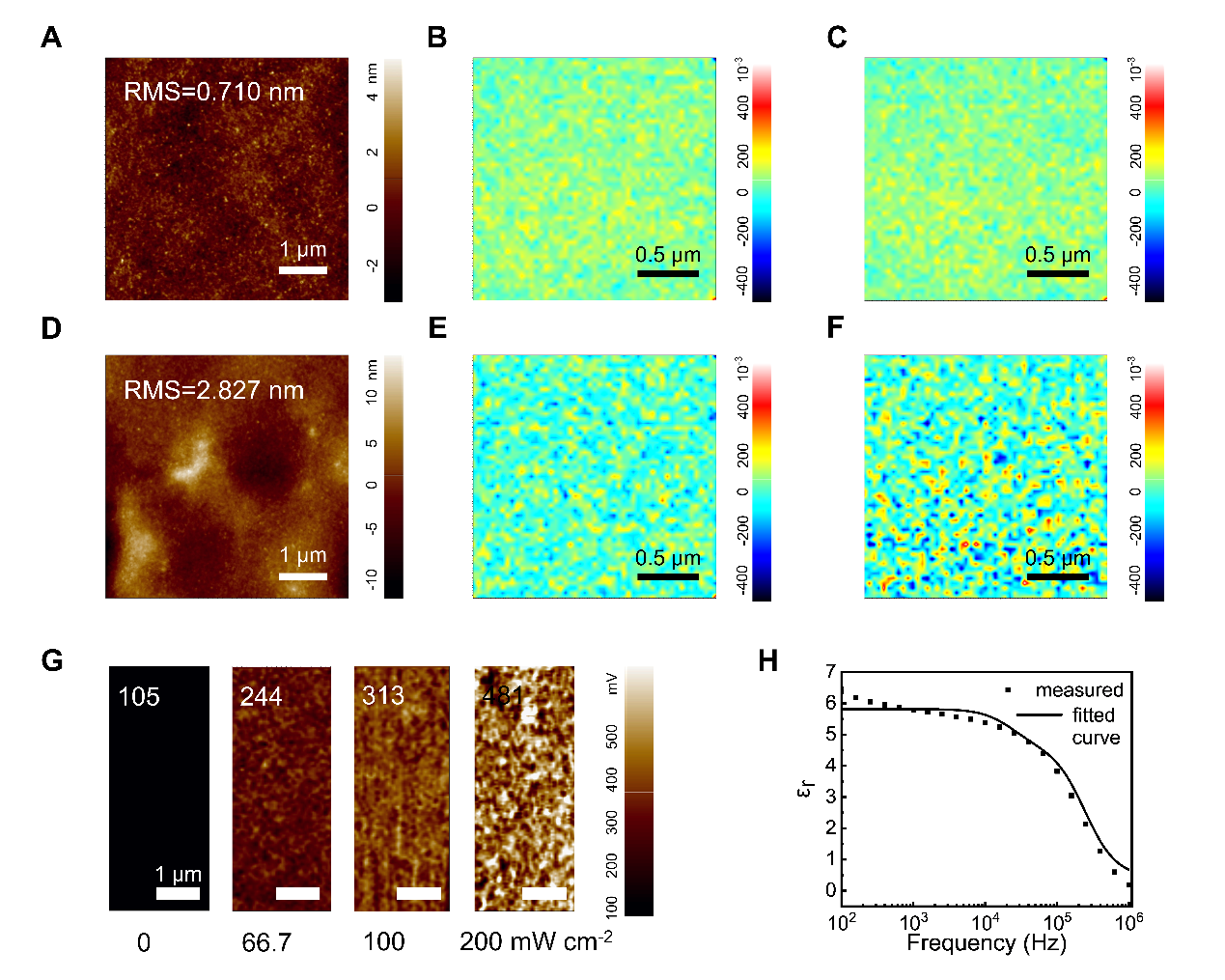 為了進一步探索柔性基底自驅(qū)動機理,研究者對薄膜的表面形貌及電荷分布進行了研究。研究結(jié)果表明,首先,聚合物在PET基底上的粗糙度遠高于Si/SiO2基底,這導(dǎo)致了PET表面更大的局域電場。相較于Si/SiO2基底薄膜在暗態(tài)下和光照下幾乎沒有變化的表面電荷分布,PET基底在光照下呈現(xiàn)出更明顯的電荷分布差異,意味著PET基底上存在著光致電荷積累現(xiàn)象,而這有利于激子在局域電場下的解離。為了進一步量化這一現(xiàn)象,又通過開爾文力顯微鏡的方式測量不同光照強度下薄膜表面電勢,研究發(fā)現(xiàn),隨著近紅外光強度從0增強到66.7,100,200 mW cm-2,平均表面電勢從105增強到244,313,481 mV,這與光強依賴的光響應(yīng)電流值是一致的。同時,共軛聚合物PBTT的相對介電常數(shù)達到了5.8,這一較高的介電常數(shù)值降低了激子結(jié)合能,從而有利于激子在無需外加電場的情況下就能解離成載流子。作為對比實驗,另一個具有短波紅外光響應(yīng)的聚合物PBTB在0 V外加偏壓不能工作,必須在有驅(qū)動電壓時才能表現(xiàn)出光電突觸的性能,它的介電常數(shù)僅為3.5,說明了大的介電常數(shù)是有利于產(chǎn)生器件自驅(qū)動性能的。