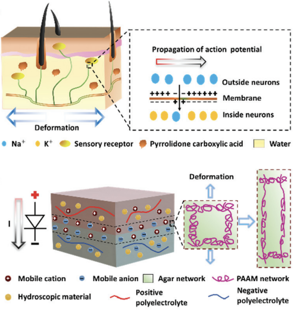 受人體皮膚啟發(fā)的離子二極管凝膠仿生皮膚示意圖
