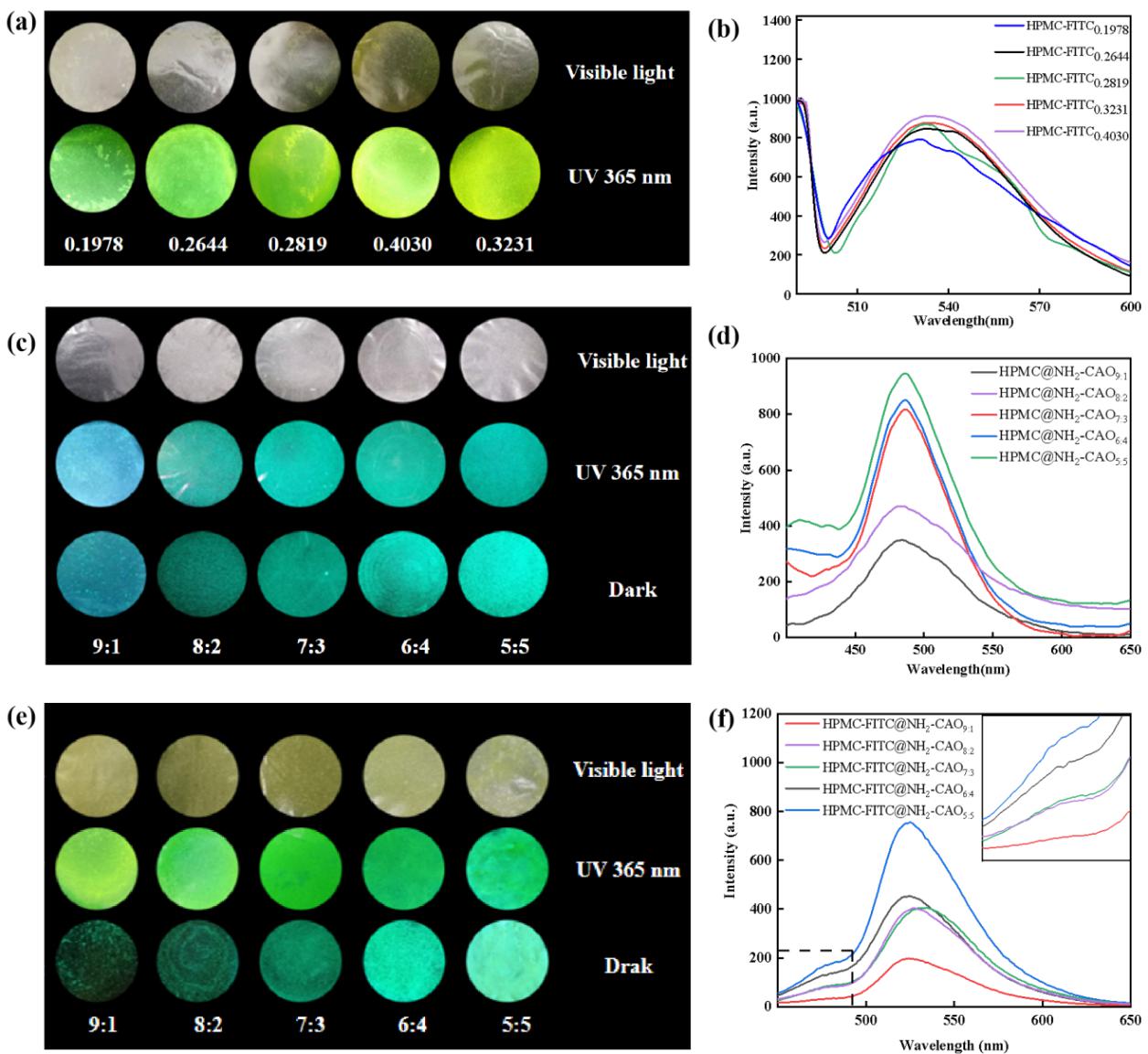 基于上述背景,西安工程大學(xué)武海良教授團(tuán)隊(duì)在前期高透亮、可折疊、可書寫的長余輝纖維素?zé)晒饽ぱ芯炕A(chǔ)上(Carbohydrate Polymers, 2021, 263, 117977),選取具有pH響應(yīng)性質(zhì)的有機(jī)熒光染料FITC和長余輝特性的無機(jī)熒光顏料CaAl2O4:Eu2+, Dy3+作為生色分子,根據(jù)它們的激發(fā)光譜和發(fā)射光譜重疊特性,制備了具有pH響應(yīng)的雙發(fā)射有機(jī)-無機(jī)雜化長余輝HPMC熒光膜(如圖1和圖2)。得益于HPMC骨架的“錨定”和“稀釋”效應(yīng),形成的HPMC-FITC和HPMC@NH2-CAO熒光溶液和固態(tài)熒光膜分別在535 nm和480 nm處發(fā)出綠色和藍(lán)綠色熒光,HPMC-FITC@NH2-CAO雙發(fā)射膜可在480和535 nm兩個(gè)發(fā)射峰長時(shí)間持續(xù)發(fā)出青色光,在極堿條件下顯示更強(qiáng)的熒光強(qiáng)度。與現(xiàn)有纖維素基熒光膜相比,本研究擴(kuò)大了纖維素基熒光膜的發(fā)射波長范圍,延長了環(huán)境響應(yīng)型熒光膜的發(fā)光時(shí)間,為制備以生物質(zhì)為基材的智能變色織物涂層材料、防偽材料和靈敏性pH傳感器件提供新途徑。