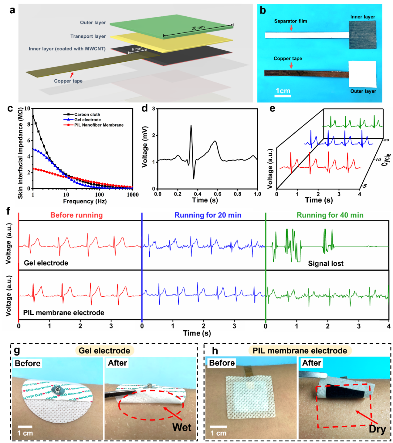 人體中活躍的細(xì)胞或組織都會(huì)定期產(chǎn)生與其狀況密切相關(guān)的電信號(hào),研究人員通過制備出的PIL電子皮膚對(duì)這些電脈沖(如ECG信號(hào))進(jìn)行拾取和記錄,使其可用于健康檢測(cè)和醫(yī)學(xué)診斷。此外,與普通凝膠電極相比,PIL基柔性電子皮膚即使在人體運(yùn)動(dòng)出汗的情況下,依然能夠準(zhǔn)確地獲取到電信號(hào),并且可以保持與皮膚接觸界面的干爽,確保信號(hào)的穩(wěn)定性和使用者的舒適度。