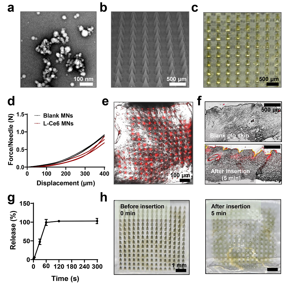 圖2 L-Ce6 MNs的表征:形態(tài),機(jī)械強(qiáng)度,豬皮刺入能力,藥物釋放