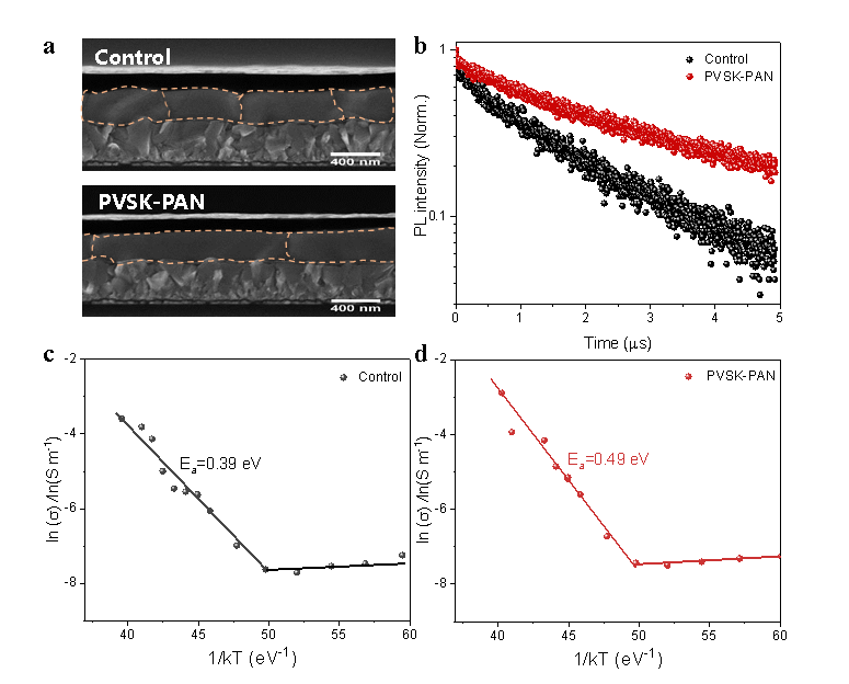 圖4. 使用不同聚合物修飾后鈣鈦礦薄膜和器件