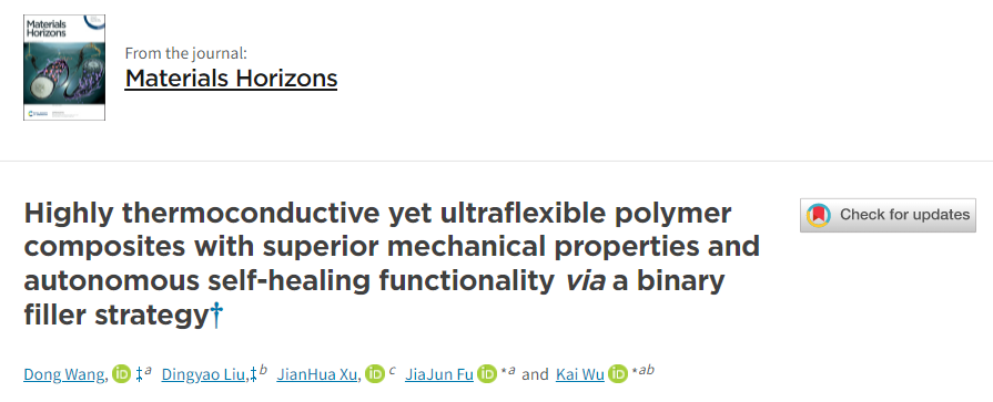 相關(guān)成果以“Highly Thermoconductive Yet Ultraflexible Polymer Composite with Superior Mechanical Properties and Autonomous Self-Healing Functionality via Binary Fillers Strategy”發(fā)表在Materials Horizons(Mater. Horizon, 2021, DOI: 10.1039/d1mh01746b)上。通訊作者為南京理工大學(xué)的傅佳駿教授和四川大學(xué)的吳凱副研究員。南京理工大學(xué)的博士研究生王東和四川大學(xué)的碩士畢業(yè)生劉丁堯為本文的共同第一作者。感謝國家自然科學(xué)基金(No. 52103091, No. 52072177, No. 51672133, U1737105, No. 51573102, and No. 51421061)、江蘇省自然科學(xué)基金(No. BK20200501)、中央高校基本科研業(yè)務(wù)費專項資金(No. 30918012201、No. 30919011405、No. 30920021121)對本工作的支持!