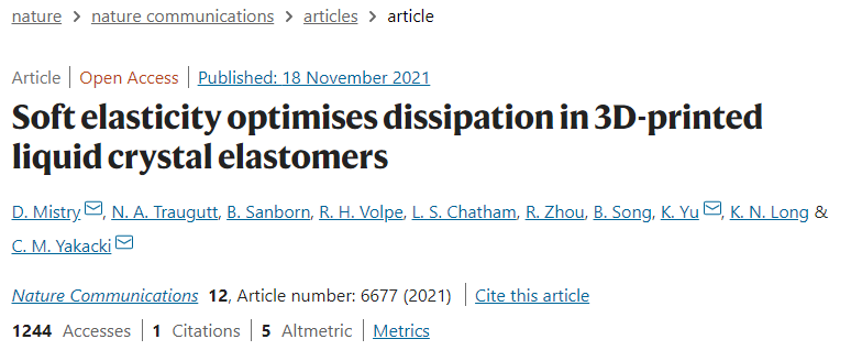 該工作以“Soft Elasticity Optimises Dissipation in 3D-Printed Liquid Crystal Elastomers”為題發(fā)表在《Nature Communications》上。文章第一作者是科羅拉多大學(xué)丹佛分校博士后Devesh Mistry。該研究得到國(guó)家自然科學(xué)基金委、美國(guó)能源部、美國(guó)橄欖球聯(lián)盟的資助。