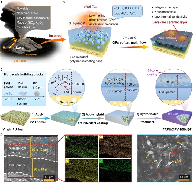 研究團(tuán)隊(duì)受火山熔巖難燃、高溫可流動(dòng)以及低熱導(dǎo)率特性的啟發(fā),設(shè)計(jì)了一種可陶瓷化的多尺度阻燃涂層材料,其實(shí)現(xiàn)了對(duì)多種建筑材料有效防火保護(hù)。