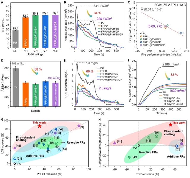 PVH@PVH/BN/GP涂層的防火性能表現(xiàn)。經(jīng)~200μm涂層處理的硬質(zhì)聚氨酯泡沫表現(xiàn)出高達(dá)35.8 vol%的極限氧指數(shù)(LOI),達(dá)到了理想的UL-94 V-0等級(jí),并且最大熱釋放速率(PHRR)(降低34%),總煙霧釋放量(TSR)(降低53%)和最大CO生成(PCOP)(降低66%)顯著降低,抗壓強(qiáng)度顯著提高(提高41%)。材料綜合性能明顯優(yōu)于此前文獻(xiàn)報(bào)道的聚氨酯泡沫(圖3,圖4)。