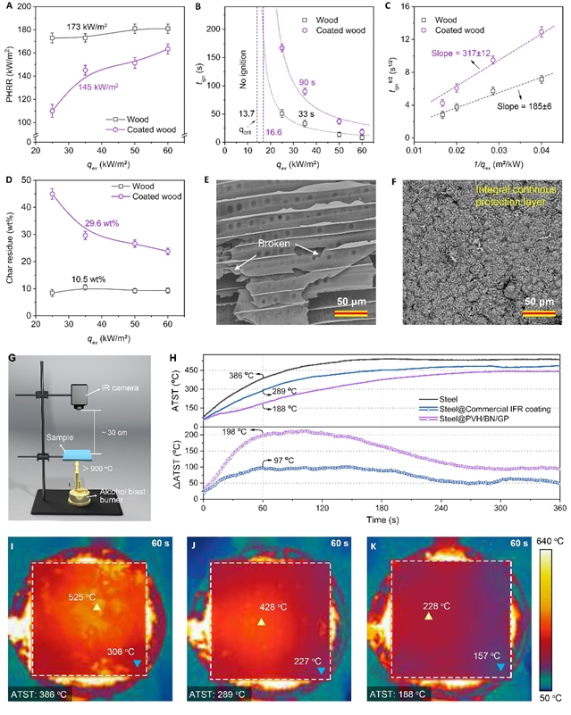 PVH@PVH/BN/GP涂層對(duì)多種基材的防火保護(hù)。錐形量熱測(cè)試中,PVH@PVH/BN/GP處理后的木材更難被引燃,且其在不同熱輻射強(qiáng)度下皆表現(xiàn)出更低的熱釋放,更高的殘?zhí)柯。此外,PVH@PVH/BN/GP同樣適用于不可燃基體,涂層處理能夠顯著減緩鋼材在持續(xù)灼燒過程中的升溫速率(圖5)。該阻燃涂層策略在不同基材上表現(xiàn)出很高的適用性,有望未來在建筑、運(yùn)輸、管道和電氣等領(lǐng)域廣泛運(yùn)用。