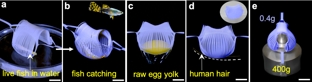 根據(jù)幾何與力學(xué)模型中,邊界曲率與高斯曲率間的關(guān)系,研究者設(shè)計(jì)了一種類似捕蠅草結(jié)構(gòu)的動(dòng)態(tài)抓手。它利用動(dòng)態(tài)變形控制能夠完成無傷害抓魚(圖4a-b)和生蛋黃(圖3c),體現(xiàn)出其在對(duì)凝膠狀海洋生物研究與保護(hù)的應(yīng)用前景。同時(shí),這款0.4g的抓手兼具了精準(zhǔn)度與強(qiáng)度,不僅能抓取人的頭發(fā)(圖4d)還能抓起自重1000倍的物體(圖4e)。這是由于它獨(dú)特的抓取方式。不同于已有的機(jī)械抓手夾取或捏住目標(biāo)物體,這種抓手利用自身的特殊動(dòng)態(tài)變形像人的雙手一樣去包裹目標(biāo),從而實(shí)現(xiàn)無傷害的抓取。研究者還展示了利用它抓取液體表面泡沫、顆粒狀物體、硬幣,體現(xiàn)出這種變形設(shè)計(jì)方法在柔體抓手領(lǐng)域廣泛的潛在應(yīng)用前景。