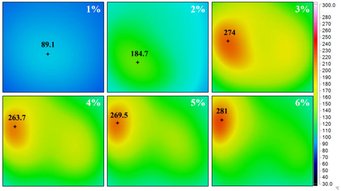 針對上述問題,武漢理工大學王鈞教授團隊進行了微波加熱熱塑性復合材料的高效、可控性研究,設計了不同含量MWCNT作為微波敏化劑填料,通過熔融共混工藝將其均勻分散到PP基體中,制備出具有微波吸收性能的MWCNT/PP復合材料,研究了MWCNT含量對材料微波加熱性能的影響及微波加熱機理,并對加熱結(jié)果進行了模擬驗證。MWCNT/PP復合材料在商用微波爐(2.45 GHz)中加熱5 s后的溫度分布如圖1所示,可以看出樣品的溫度在MWCNT的質(zhì)量分數(shù)為3%時達到最高(290 ℃)。