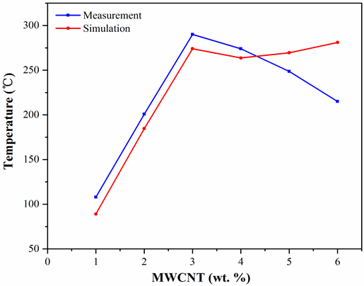 利用微波-熱耦合仿真對材料微波加熱進行模擬的結(jié)果如圖4所示,與實測的樣品最高溫度對比如圖5所示。當MWCNT質(zhì)量分數(shù)小于4%時,其最高溫度隨質(zhì)量分數(shù)變化的模擬結(jié)果與實驗結(jié)果吻合較好。而當MWCNT的質(zhì)量含量大于4%時,其最高溫度的模擬結(jié)果出現(xiàn)了小幅上升。MWCNT質(zhì)量分數(shù)為6%時的模擬最高溫度為281 ℃,實測值為215 ℃。測量與仿真結(jié)果差異的原因可能是分析模型過于簡化、微波源功率不恒定等。此外,填料在樣品制備過程中難以實現(xiàn)理想的均勻分散。多壁碳納米管填料在試樣表面的團聚會增加屏蔽效應的作用,使得現(xiàn)實中能夠有效進入材料產(chǎn)生熱量的微波能量減少。因此,測得的最高溫度將呈現(xiàn)下降趨勢,而不是保持一個穩(wěn)定的范圍。雖然當MWCNT含量大于4%時,樣品的最高溫度模擬結(jié)果略有提高,但當MWCNT質(zhì)量含量大于3%時,模擬值趨于穩(wěn)定,變化不大。因此,根據(jù)實驗和模擬結(jié)果,可以判定MWCNT/PP復合材料在MWCNT填料質(zhì)量含量為3%時具有最佳的微波加熱性能,且材料在微波加熱過程中電導損耗為主要損耗機理。