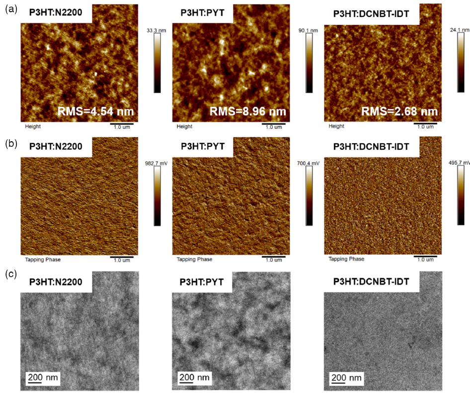 圖3. P3HT全聚合物共混薄膜的(a)AFM高度圖、(b)AFM相圖和(c)TEM襯度圖。