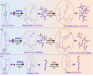 圖1 通過RAFT溶液聚合和RAFT分散聚合合成:(a)PDMA-(HEA-BTSMA)和PSt-PDMA-(HEA-BTSMA);(b)(BTPA-HEA)-PDMA和(BTPA-HEA)-PSt-PDMA;(c)PDMA-BTPA和PDMA-PSt-BTPA的示意圖