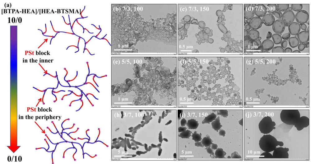 圖6 (a)由不同比例[BTPA-HEA]/[HEA-BTSMA]合成的大分子RAFT試劑調(diào)控制備的SHBCs的結(jié)構(gòu)示意圖;(b-j)由不同比例[BTPA-HEA]/[HEA-BTSMA]合成的大分子RAFT試劑在70 ℃條件下調(diào)控St的RAFT分散聚合制備的SHBCs的TEM照片