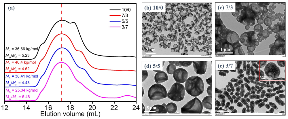 圖7 由不同比例的[(BTPA-HEA)-PDMA20.4]/[BTPA-HEA]調(diào)控St(的RAFT分散聚合制備的SHBCs的THF GPC曲線圖(a)和TEM照片(b-e)
