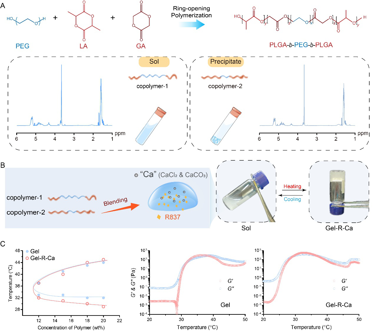 TPV凝膠采用基于聚酯-聚醚嵌段共聚物作為可注射水凝膠的基材,通過丁建東團隊提出的“block blends”策略賦予體系獨特的“低溫溶液,體溫凝膠”特性(圖2)。這種 “block blends”將單獨可溶于水的嵌段共聚物-1(copolymer-1)和不溶于水的嵌段共聚物-2(copolymer-2)共混后產生物理凝膠化的窗口。該可注射水凝膠制劑特別適合用于術后注射。而針對乳腺癌等術后患者,凝膠的填充尤有意義。