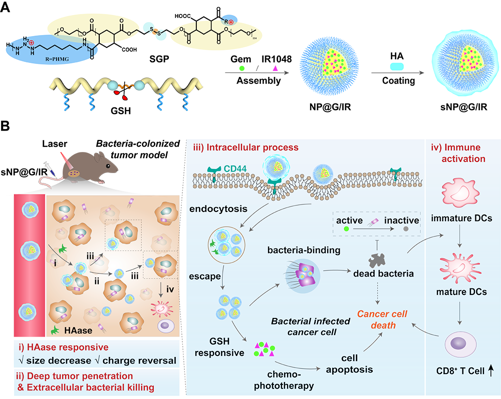 胰腺癌是一種高度致命的惡性腫瘤,經(jīng)過數(shù)十年的努力,其五年生存率仍低于10%。目前胰腺癌化療面臨的挑戰(zhàn)包括:(i)腫瘤生物屏障阻礙藥物穿透和細(xì)胞內(nèi)化,遞送效率低;(ii)藥物失活降低化療效率,并產(chǎn)生耐藥性。研究指出,腫瘤內(nèi)存在的共生細(xì)菌介導(dǎo)了化療藥物的失活(Science 2017, 357, 1156):細(xì)菌酶將藥物代謝成非活性形式,最終導(dǎo)致耐藥性。深入研究表明,大多數(shù)胰腺癌患者的腫瘤中存在共生細(xì)菌,且主要是胞內(nèi)菌(Science 2020, 368, 973)。因此,亟需開發(fā)一種新策略,既能增加藥物的滲透,又能優(yōu)先清除腫瘤中的細(xì)菌(胞外菌和胞內(nèi)菌),以提升胰腺癌的治療效果。