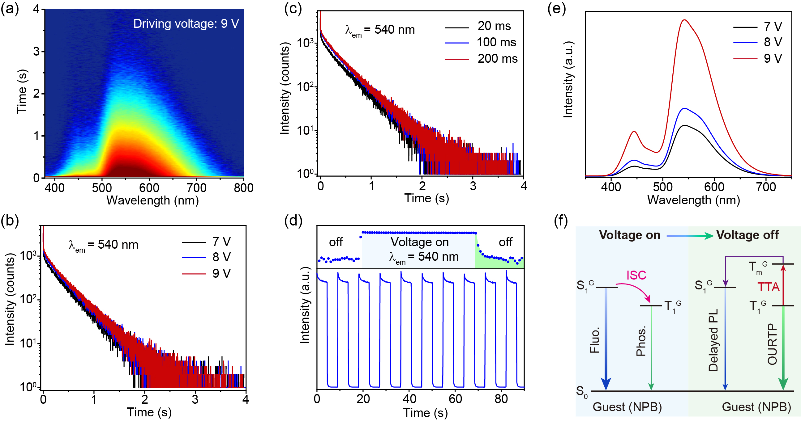 另外,令人興奮的是,該類余輝OLEDs顯示出優(yōu)異的長余輝發(fā)射穩(wěn)定性,在超過10個開關(guān)周期后,其發(fā)光強(qiáng)度和余輝壽命幾乎保持不變(圖4),這歸因于發(fā)光層摻雜薄膜固有的穩(wěn)定余輝性能和器件平衡的載流子傳輸。此外,作者還分析了此類余輝OLEDs的發(fā)光過程:在外加電壓下,由于客體單線態(tài)激子的熒光強(qiáng)度遠(yuǎn)遠(yuǎn)大于其三線態(tài)激子的磷光,所以在這個過程中只能觀察到客體藍(lán)色熒光發(fā)射,當(dāng)外加電壓關(guān)閉時,由于客體單線態(tài)激子的壽命短,熒光發(fā)射瞬間消失;同時,壽命超過300 ms的三線態(tài)激子則衰減緩慢,產(chǎn)生肉眼可見的綠色余輝。