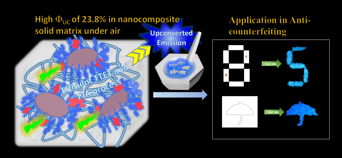 該工作以“Triplet-Triplet Annihilation Upconversion in Laponite/PVP Nanocomposites: Absolute Quantum Yields up to 23.8% at Solid-State and Application to Anti-counterfeiting”為題發(fā)表在《Materials Horizons》上。四川大學(xué)化學(xué)學(xué)院伍晚花副教授為論文通訊作者,楊成教授為該論文的發(fā)表提供全面指導(dǎo)。四川大學(xué)化學(xué)學(xué)院魏玲玲博士為論文第一作者,四川大學(xué)為第一單位。該研究得到國家自然基金、國家重點研究與發(fā)展計劃項目、四川省科技廳項目的支持。
