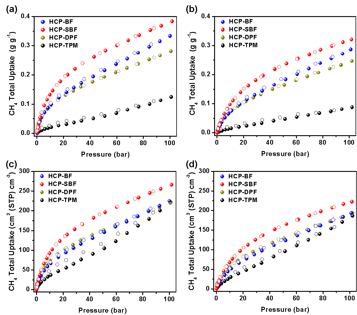 基于此,華中科技大學(xué)譚必恩教授團(tuán)隊(duì)采用具有逐步微調(diào)結(jié)構(gòu)剛性的構(gòu)筑單元,采用該團(tuán)隊(duì)發(fā)展的溶劑編織策略(Sci. Adv., 2017, 3: e1602610),制備了具有可調(diào)孔結(jié)構(gòu)的HCPs(圖1a)。該工作研究了構(gòu)筑單元結(jié)構(gòu)剛性與其對(duì)應(yīng)的HCPs孔結(jié)構(gòu)和其高壓甲烷存儲(chǔ)性能之間的構(gòu)效關(guān)系。研究結(jié)果表明,通過逐步減少構(gòu)筑單元中的烷烴鏈長或增加結(jié)構(gòu)共軛性可實(shí)現(xiàn)其結(jié)構(gòu)剛性的增加(圖1b),且所制備的HCPs相應(yīng)地從低孔隙率的框架逐漸演變成富含微孔的網(wǎng)絡(luò)結(jié)構(gòu),實(shí)現(xiàn)了BET比表面積在37-2368 m2 g-1和孔徑1.83-7.28 nm范圍內(nèi)的調(diào)控(圖2)。同時(shí),這些材料表現(xiàn)出優(yōu)異的高壓甲烷存儲(chǔ)性能和結(jié)構(gòu)穩(wěn)定性。在273 K/5-100 bar測(cè)試條件下,基于相對(duì)剛性9,9''''-螺二芴(SBF)的HCP-SBF和基于相對(duì)柔性四苯基甲烷(TPM)的HCP-TPM,分別表現(xiàn)出206 cm3(STP)cm-3(0.296 g g-1)和199 cm3(STP)cm-3(0.112 g g-1)的可輸送甲烷存儲(chǔ)量(圖3),具備在ANG系統(tǒng)中應(yīng)用的潛力。該工作有望為HCPs孔結(jié)構(gòu)自下而上的定制化設(shè)計(jì)并在高壓甲烷存儲(chǔ)領(lǐng)域的應(yīng)用發(fā)揮重要的指導(dǎo)作用。