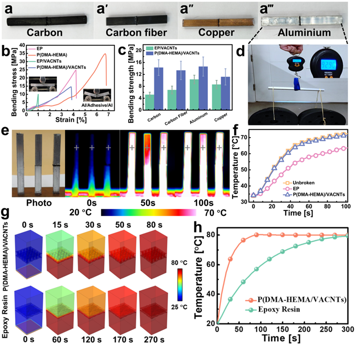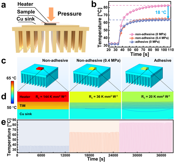 (3)P(DMA-HEMA)/VACNT的優(yōu)異導(dǎo)熱性和粘附能力實(shí)現(xiàn)了對(duì)導(dǎo)熱通路的異質(zhì)修復(fù)。此外,該復(fù)合材料在無(wú)應(yīng)力條件下作為熱界面材料表現(xiàn)出優(yōu)異的熱穩(wěn)定性和可靠性。因此,它作為高強(qiáng)度和長(zhǎng)期使用的散熱器組件具有巨大的應(yīng)用潛力。