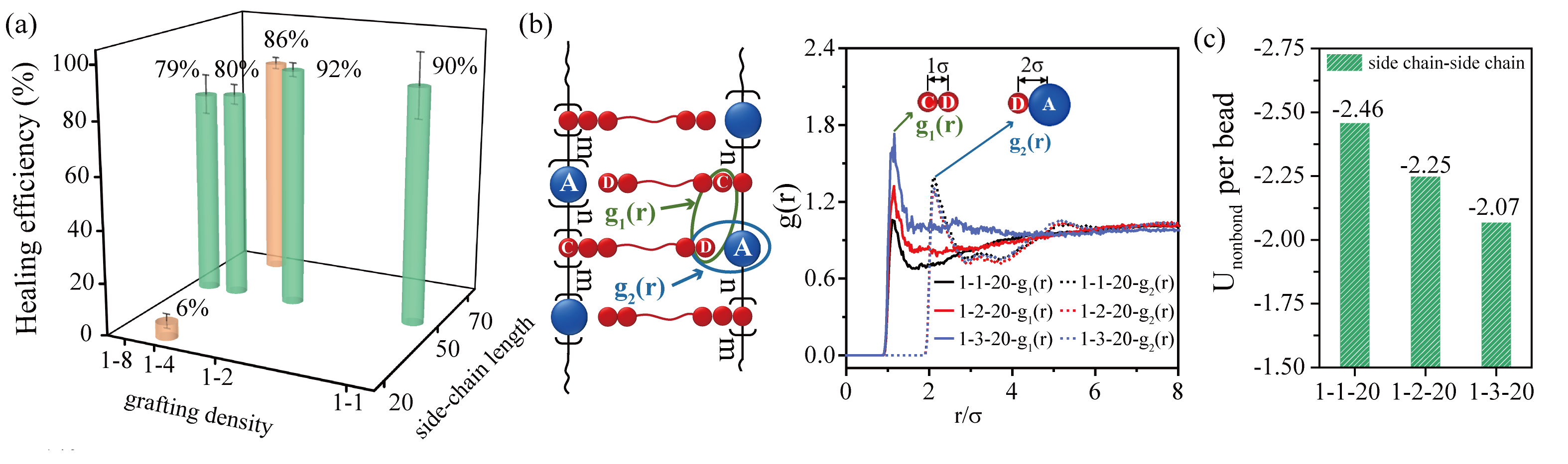 圖3 (a)刷狀聚合物的修復效率;(b)不同接枝密度的刷狀聚合物的徑向分布函數(shù)g(r);(d) 不同接枝密度的刷狀聚合物中每個均化側(cè)鏈珠的非鍵能。