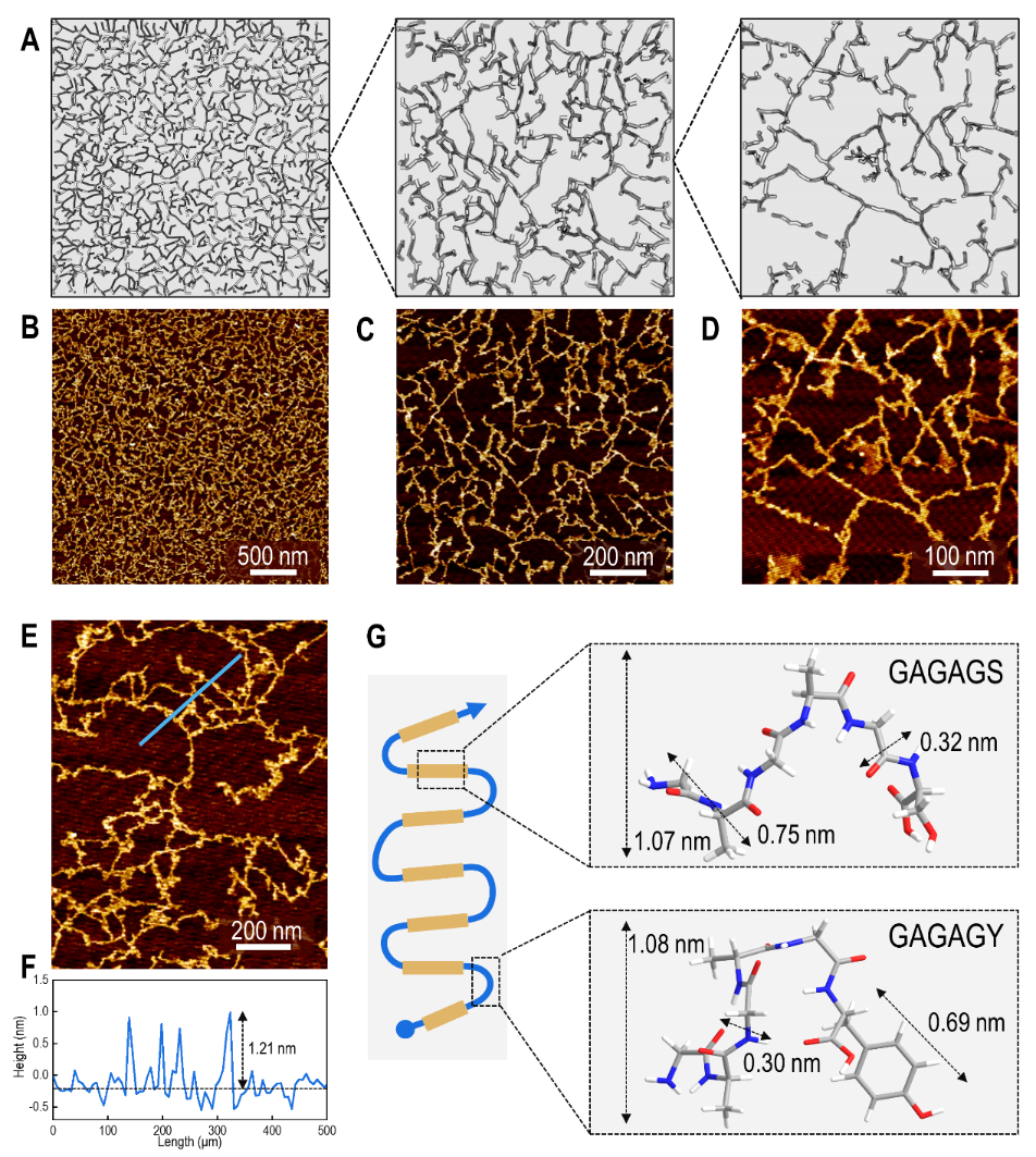 圖 2 (A)-(D)不同放大倍數(shù)下的絲蛋白網(wǎng)絡(luò)原子力顯微鏡圖像和3D示意圖。(E)-(F) 絲蛋白分子的高度。(G) DFT計算的短肽高度。