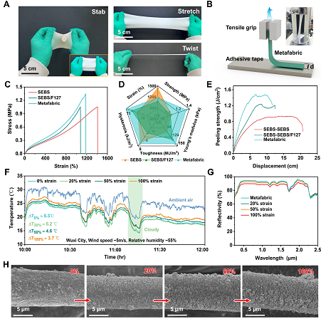 4. 超織物的快速水分蒸發(fā)(0.31 g/h)和高水分輸送指數(shù)(1220%)提供了良好的熱濕舒適性,可以預(yù)防劇烈運(yùn)動(dòng)后的熱相關(guān)疾病。此外,他們發(fā)現(xiàn)超織物在不同應(yīng)變(0% ~ 100%)下具有機(jī)械自適應(yīng)冷卻性能,從而對(duì)穿戴過(guò)程中產(chǎn)生的復(fù)雜變形具有良好的適應(yīng)性。
