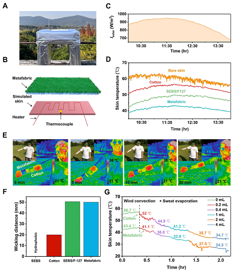 圖6. 超織物的熱、蒸發(fā)測(cè)試及其可穿戴性能